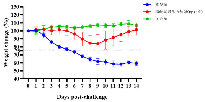 图11.小鼠流感攻毒模型(H1N1/PR8)给药后的体重变化趋势