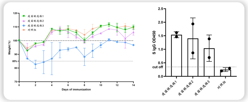 图7.新冠疫苗评价-hACE2 小鼠模型体重变化及存活率(疫苗接种后)