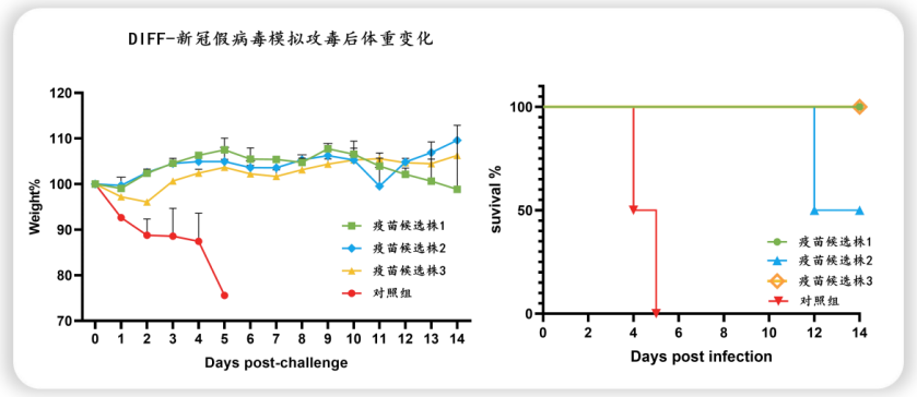 图8.DIFF新冠假病毒模拟攻毒体重变化及存活率(攻毒后)